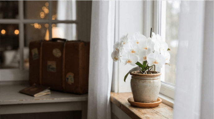 旅行の準備を進めているとき、ふと視線が止まる——窓辺に置いた胡蝶蘭の鉢に。「この子、ちゃんと留守番できるかな?」という不安、私もかつては何度も感じました。